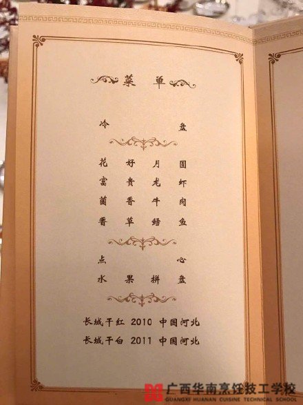 国宴作为国内最牛的饭局,一丝一毫都受到了各方关注。此次“一带一路”国际合作高峰论坛欢迎晚宴,除了冷盘、点心、水果之外,菜单上主要含有四道热菜,分别是富贵龙虾、菌香牛肉、香草鳕鱼和花好月圆(根据英文的翻译应该是鸽子蛋和扇贝汤)。