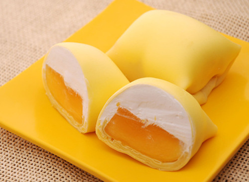 5. 鲜奶油加糖打至全发,铺在放凉的饼皮上,放上一块芒果,包成方形。