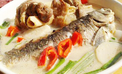 3、将鳃鱼块垫底,羊肉皮朝上排在鱼身上,装上头、尾,浇上卤汁。