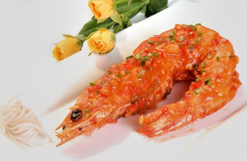 3、倒去锅中余油,下豆瓣酱,炒出红色,再下板油丁、姜、蒜丁,炒香后加汤,放虾、酱油、料酒、味精,烧透入味,下葱花、醋,将汁收干亮油装盘,豌豆尖洗净炒熟,放在大虾面上即成。