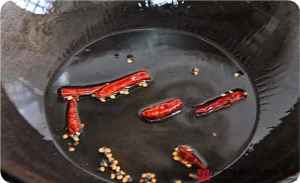 6、温油放入干辣椒爆香炸出香辣味,并再把干辣椒取出弃之,如果青辣椒比较辣,就可以省略此步骤。