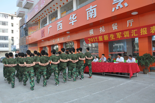 7月,激情飞扬,是热血的,是朝气的。华南烹饪学校2011年新学员军训汇演在7月29日举行。广西华南厨师烹饪学校负责人朱伟、教务处主任万玲、实操大师黄盛等出席了此次汇演。正步走、口号操练、队列前进等精彩表演让现场观众应接不暇,大呼震撼。这宣告了为期两周的新生军事课教学训练终于进入了尾声。