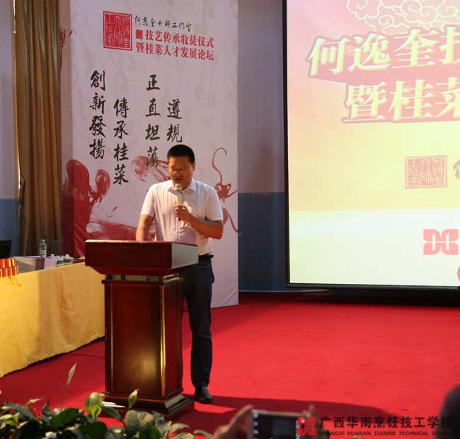 6月25日上午, 由广西华南烹饪技工学校和何逸奎大师技能工作室联合举办的“何逸奎技艺传承收徒仪式暨桂菜人才发展论坛”在我校中尧校区大礼堂举行。来自全国各地以及部分海外餐饮大咖近百人人参加了本次论坛。论坛由著名导演殷新春主持。
